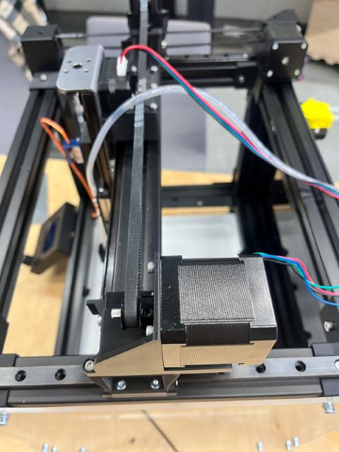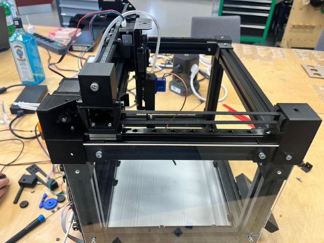 A tensioning mechanism in the upper front left corner holds a 6mm GT2 timing belt which is clamped down on a 3D printed piece that holds the X-axis gantry.
