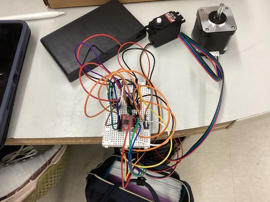 After this, Noah Smith (our coding genius) started to code the motor and the servo and made the motor spin like what we want and the servo spin constantly.
