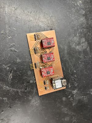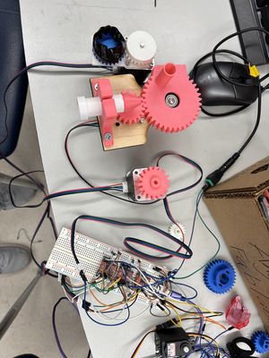 Right as we were nearly done with this project, The port for the stepper driver farthest away from the microcontroller stopped working. We think its a ripped trace, which we believed using enough hot glue to completely cover the area and prevent the driver being taken out of its socket also ripping out the copper would be enough, but it simply stopped working. It would cause the motor to vibrate a little, so power was coming, but control signals were not. This was originally connected to the motor that actually bent the wire, but because this was 1 of 2 required motors (the feed and the bend), we had to repurpose the middle motor, which originally rotated the “spine” to operate that wire.