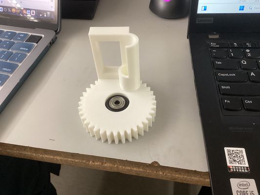The first version I prined out of that design was rectangular, which I quickly realized would not work when the gear was not able to turn to the extent it should. I realized it was because of the design of the gear, how there was a portion underneath that would get caught in the corner of the rectangular design. To accomodate for that, I rounded the corners of the design in hopes it would be enough for the gear to turn all the way.