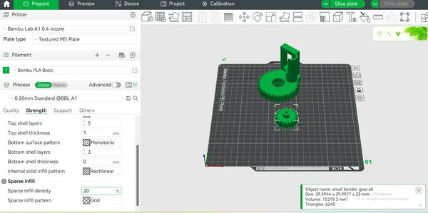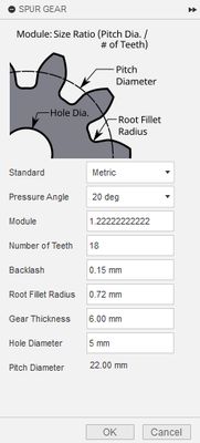 I used the following settings for the smaller z-axis gear. The larger one will have the same module but differing thickness, teeth number, and diameter.
