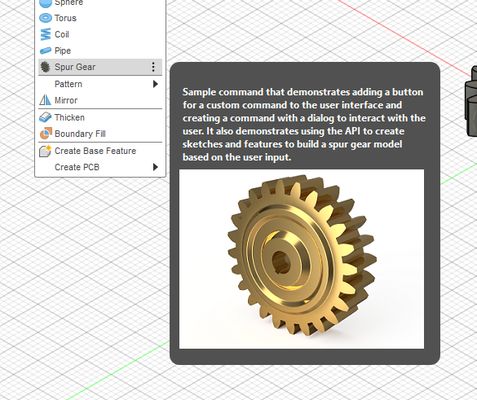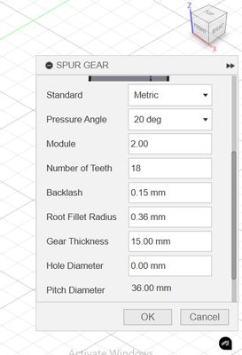 In designing the gears, there was a really nice feature that Angel found. Under Utilities -> Add-Ins -> Scripts and Add-Ins -> Spur Gears, there is a window where you can input the metrics for the gear that you want and it can be automatically made.