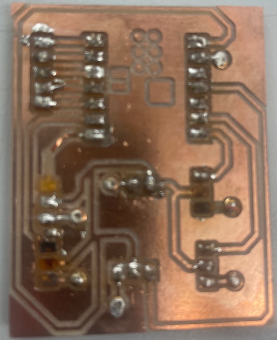 For the milling, I had already made a board similar to this one so I followed the same procedure where I would do the holes and fcuts first, flip the board over, and then do the bcuts and the edge cuts. After milling the board heres the fianl result of the board on both sides. After milling and soldering heres what the final design turned out like: