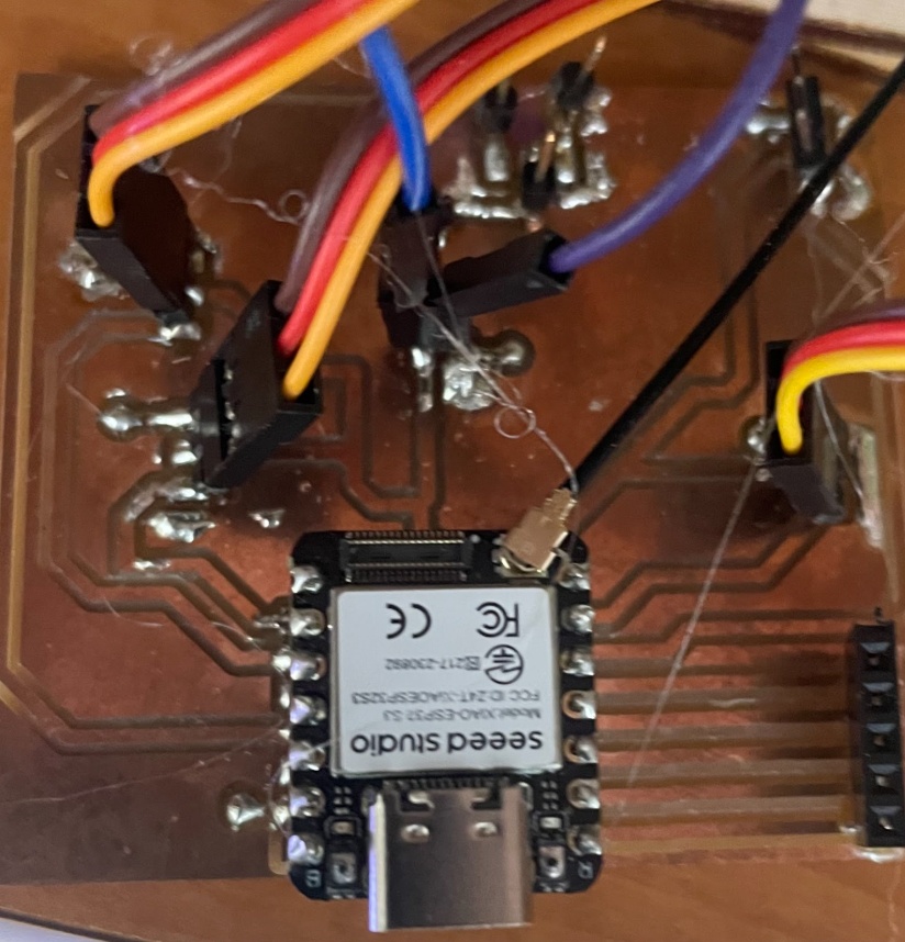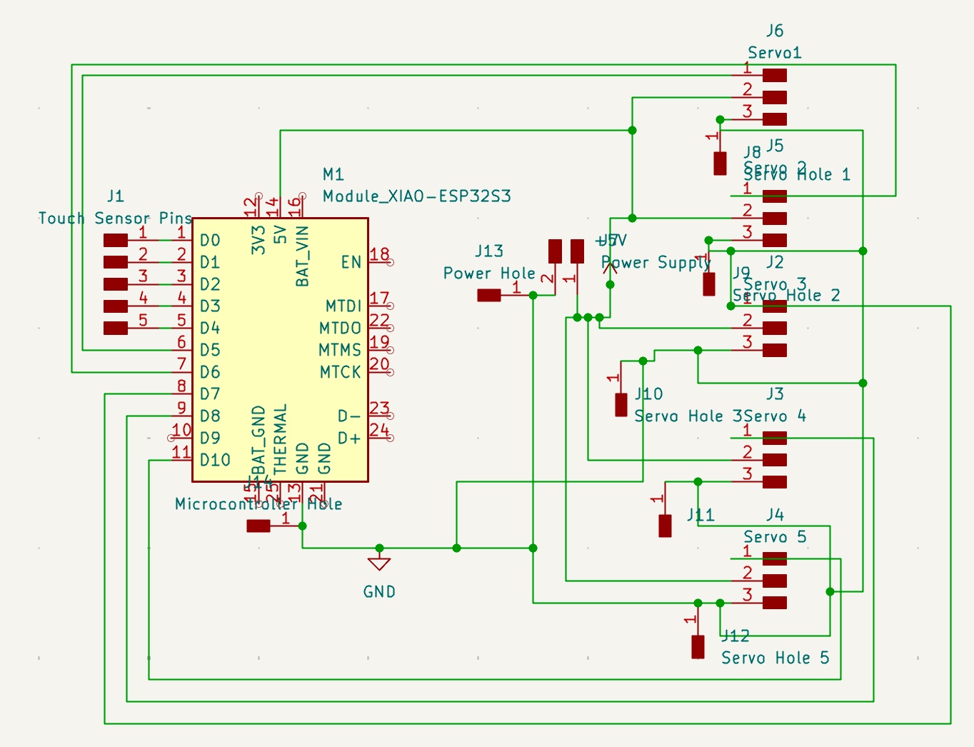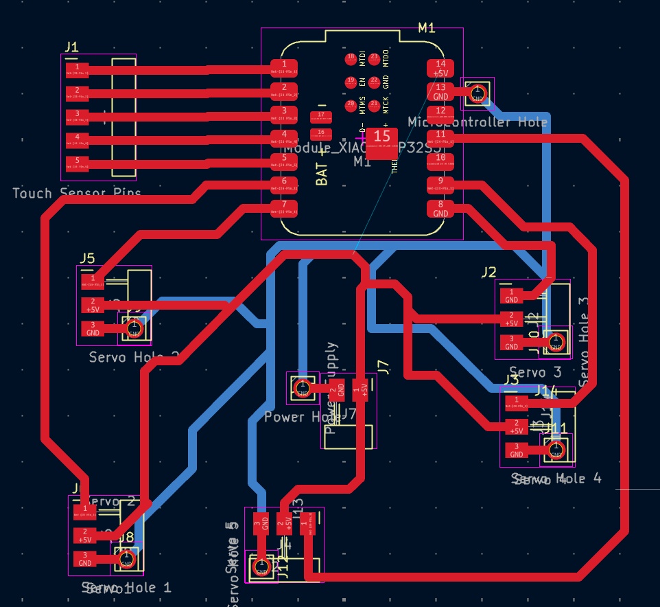 Finally in the PCB editor while looking at my initial sketch, I made the board with all the correct wiring. One thing to note is that not only was the double sided board nessicary because of all the wiring, it also was needed to create a common ground shared between the ESP32C3, all the servos, all the touch sensors, and the external power supply for the servos. After a bit of struggling to postion all of them this is the final result: