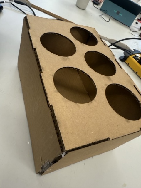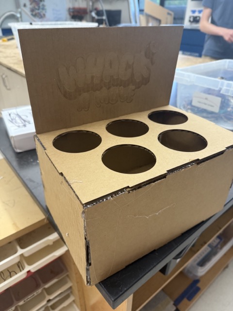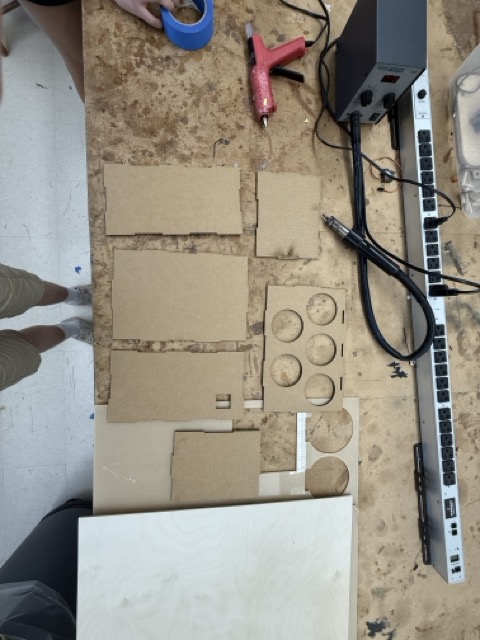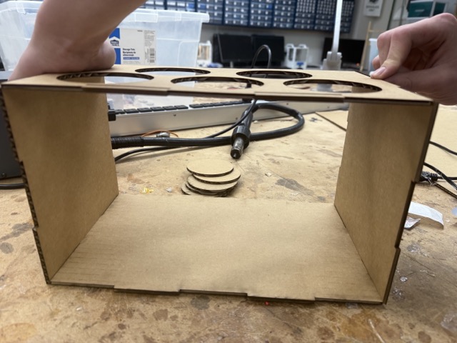 While Elle and Cooper worked on getting all the heads to move up and down, I worked on making the case for our game. I wanted to laser cut the case because I feel very comfortable using the laser cutter and thought it would be the easiest thing to use for precise cuts for this project. I designed the file in CorelDraw, cardboard cut it, and then eventually, when all the dimensions were essentially perfect, I laser cut on 1/8” wood. It took several cardboard cuts with different dimensions to finally get the box to fit nicely. Once I laser cut all the pieces, I used hot glue to stick them together, but I left the lid off, so that the Servos could be placed inside.