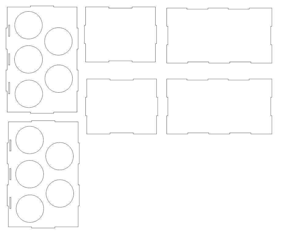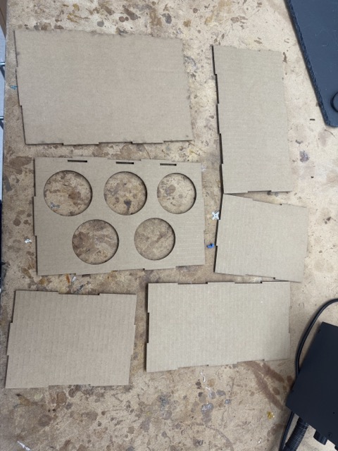 Cooper recommended that we make it press fit, so I designed a case that was approximately 7 inches tall and 12 inches wide. I made a 1” by 1” hole in the back side for the power source and on the top, I made 5 evenly spaced circles with diameters around 3”. At the back of the top, I made some grooves for the backboard of our game.