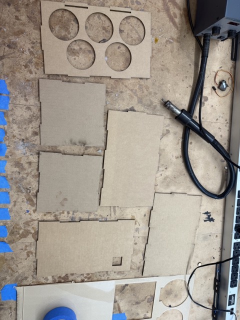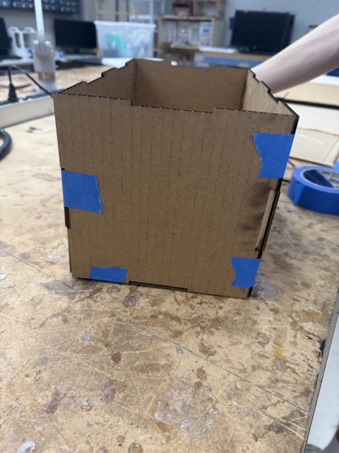 I laser cut the box 3 times on cardboard before finally getting it to look good enough. One of Andrew Puky’s friends was visiting from Germany and wanted to participate, so he helped hot glue the second and third cardboard tests together.