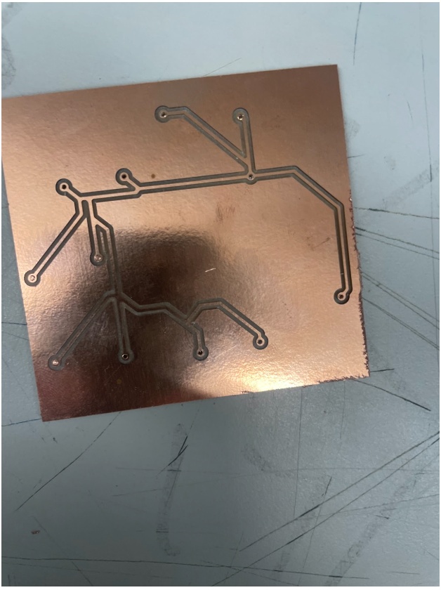 After the board was designed, I milled out my first board but when I soldered it multiple traces ripped so I had to give up on it. Heres the failed board: