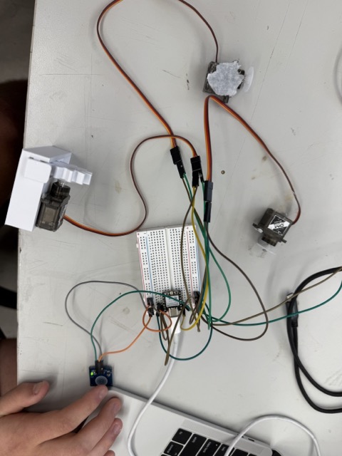 Combinging the servos and touch sensors were hard at first because we weren’t sure how to wire it and make the code work. To fix this we plugged each servo into a new digital pin on the seeed. Then once we did that I looked at the code and studied it for a long time. Then after that I realized that the code was very simple and I just needed to make 5 different variables for all the different servos and touch sensors. Then once I did that, the code was as simple as if the touch sendor 1 is clicked the head 1 goes down. Below is a video of first getting 2 to work at once.