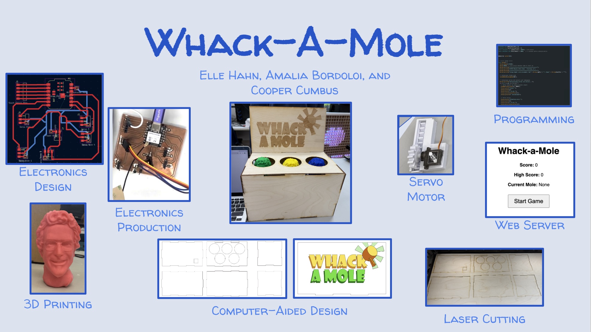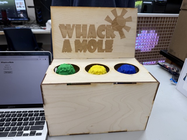 We wanted to make something fun for machine week, so we decided to make a Whack-A-Mole game. We asked ChatGPT for a bunch of ideas, and ultimately decided that Whack-A-Mole would be the most exciting.