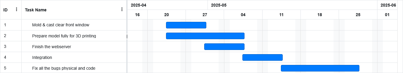 - Integration depends on everything else, as its the last step of the operation. Im planning on leaving a lot of time for it, and in general getting my final project done 4-2 weeks early