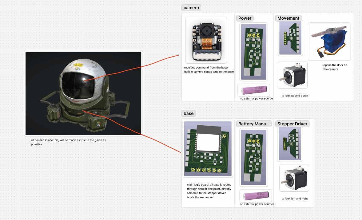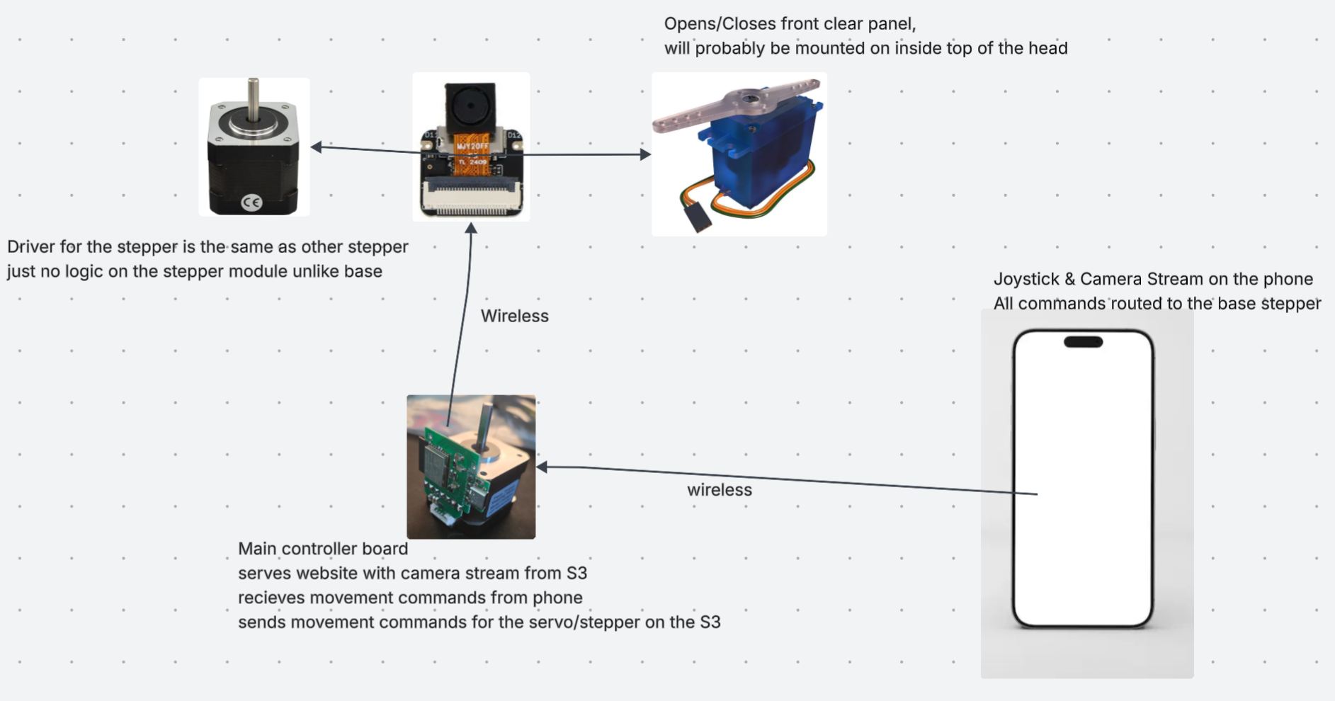 The majority of it will be 3d printed, probably with PETG as thats what I have lying around. Im also going to use clear acrlyc, probably 1/4th inch thick for the windows. On the electronics side, it will use 2 stepper motors and their required drivers, 2 microcontrollers, one definitely being the seeed xiao esp32-s3 sense because of its built in camera, and another being some wifi enabled microcontroller, likely another esp series chip. In order to power it all, it will use a battery management board to supply a stable voltage, which will be connected to a single 18650 3.7v atleast 2500mah cell each.