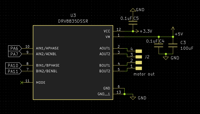 The driver is kinda my standard by this point. its just such a goated chip, as its cheap, easy to use (I guess its not like i2c but still), and works really well for my use cases. I've used this for regulator motors too, with this exact schematic. Only bad thing I can say about this, and about the driver really is that on the final boards im using I forgot to add a spot for a second capacitor, and instead stacked 2 which worked and saved space, so could be a cool trick to pull off in the future