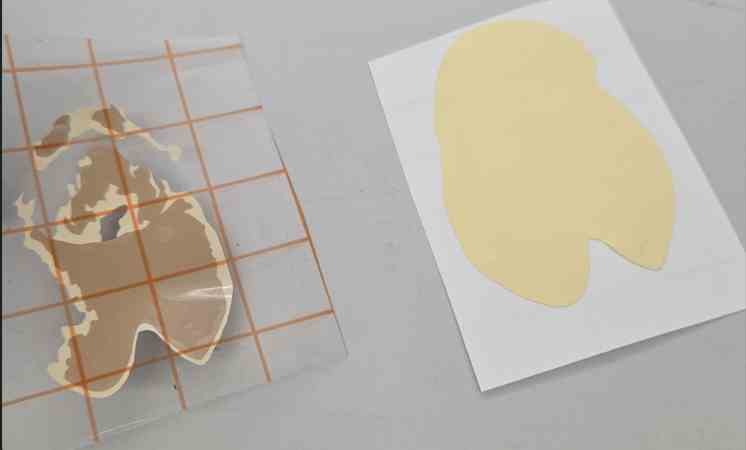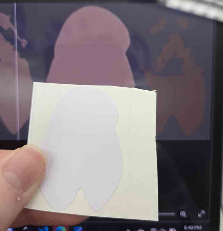 After tracing, I went to find the material to use. 2 of the 3 colors were really easy to find, but the third was both hard to find, and once I found it it was also barely enough material for a single cut. In order to prevent that cut from being a failure, I decided to do a test cut first. Thanks to the fact that I managed to get one of our labs newer vinyl cutters, I was able to quickly cut out a test. our labs vinyl cutters only work with silhouette studio, which is not the most advanced software, and lead to another problem. In scanning the different stages of scoobert into silhouette , I found that the darker side was unable to be scanned, and therefore had to change the colors of him in order to fix it.