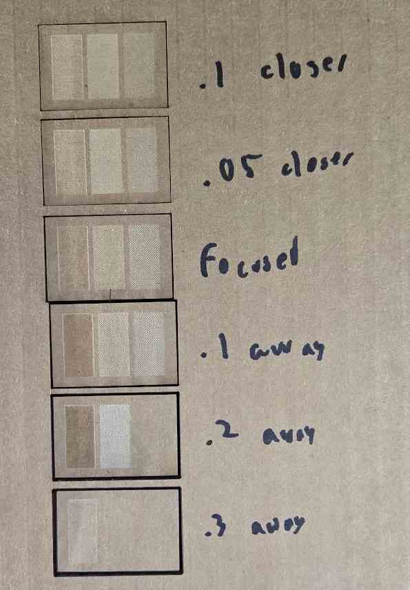 In order to test focus, we first manually homed into the perfect focus, then offset by different amounts to see its effects. We kept all other settings at their defaults, which were probably found by students of fabacademy past. We found that as we got closer to the material, it started producing more flames but the line was thinner. As we got farther from the material, it started cutting more at once and producing more flames. We therefore devices that when the machine was focused right was best, except for when kerf was such a problem that focusing closer would be a better option. For engraving colors, we found that at around .2 inches farther away the black was much more visible.