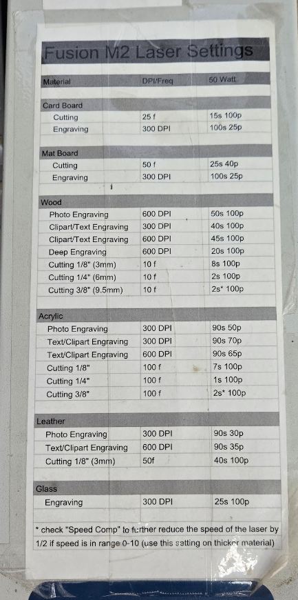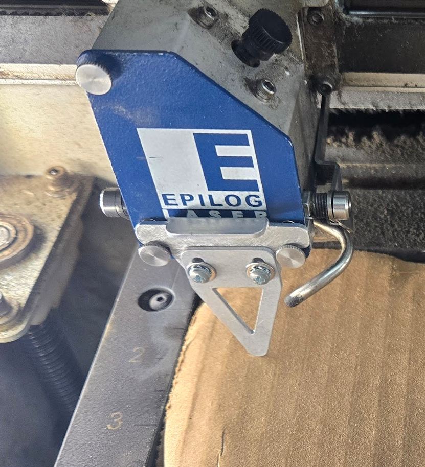 Before cutting, I had to choose which cutter I used. I decided on the oldest one in the lab, solely because it had a really accurate manual focus(seen on the right) and it seemingly has better kerfs that the others. The others are more modern, cut faster, have better safety features, and a feature that makes the, 10x better than the one I chose. The better feature is a camera built into the cutter, that allows for really easy cut positioning. The laser cutter I used was the Epilog Laser Fusion M2, specifically the 32 inch variant. This is a really good laser cutter, but held back by the fact that it was released 11 years ago. According to it's owners manual, It can cut cardboard at 20-30 inches per second, and has the capability to account for all of the features that the better cutters have, but the cutter at our lab doesn't.