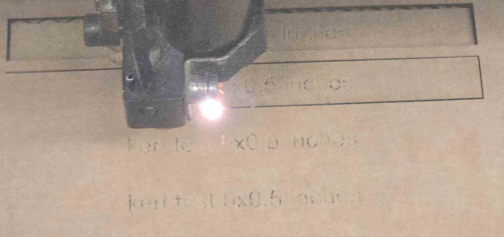 In order to test the kerf, we made 5 cardboard strips that were supposed to be exactly 5 inches. By comparing their real sizes to the size they were supposed to be, we could find the kerf. The caliper that we used could go to 3 decimal places, so accuracy in measurement was not a worry. After checking all 5 strips, we found that the kerf of our laser cutter to be 0.0144 inches. Of course, this is on cardboard, which is known for having a higher kerf than other materials, and A group from last year found that be as low as 0.012 inches for a wooden piece.