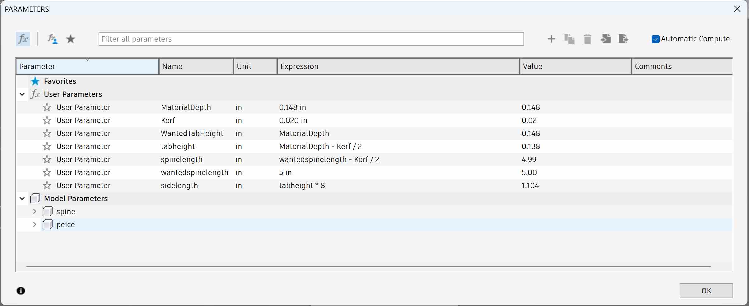 Through changing the materialdepth (how thick the cardboard was in my case) and the kerf of the laser cutter it would dynamically update to ensure proper fitting between the spine and blocks.