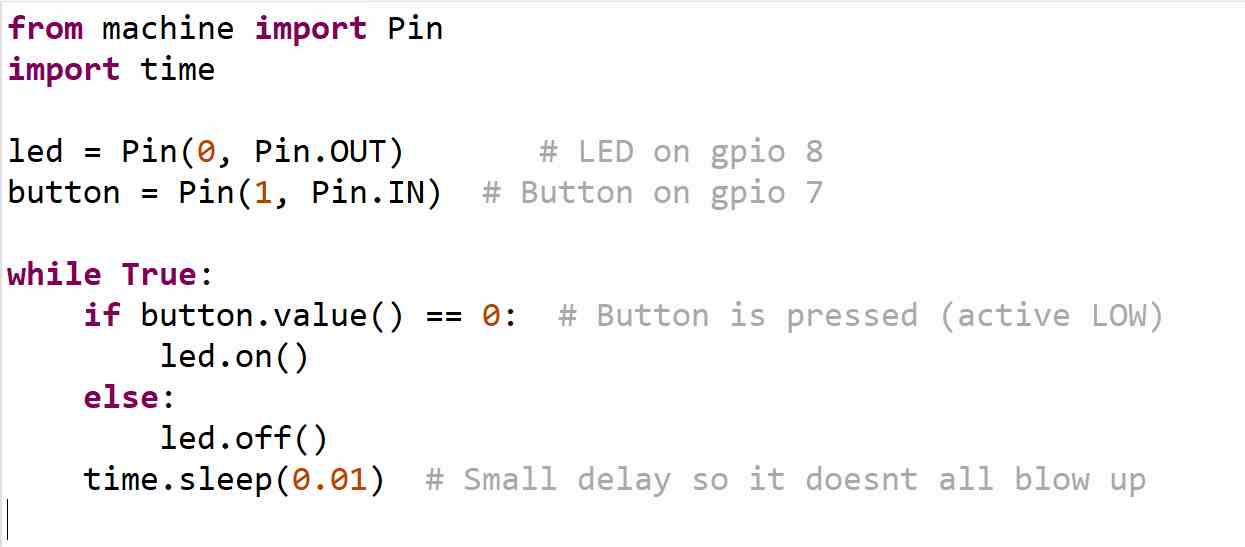 arduino c++ is based on c++, while micropython is based on python, meaning that micropython is generally easier and faster to work with. Micropython does not have the same preformance as c++, which is why it isnt availble on the ATTiny Here is an image of the code I used throughout testing these microcontrollers, in order to compare the structure of arduino to micropython