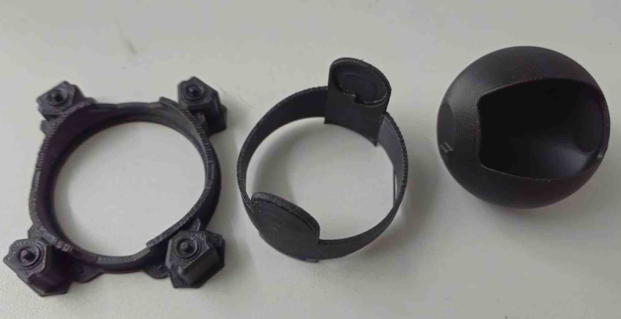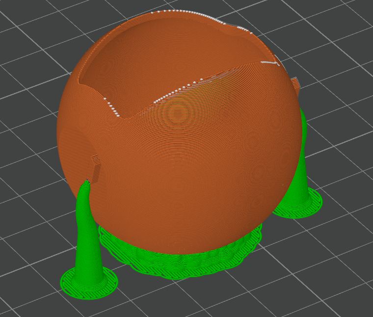 while it does move the way I want it, the head is much too loose, and I defiantly need a better way to hold it on in the final build. I also need to figure out how I am going to make it all, but it will probably end up being the sphere head is exactly small enough to fit on a bambu lab a1 printer or even an x1 carbon, as our lab has one of those with a .8mm nozzle. I also have to fix some small bits that this print pointed out, like the walls being too thin on the arms holding the head