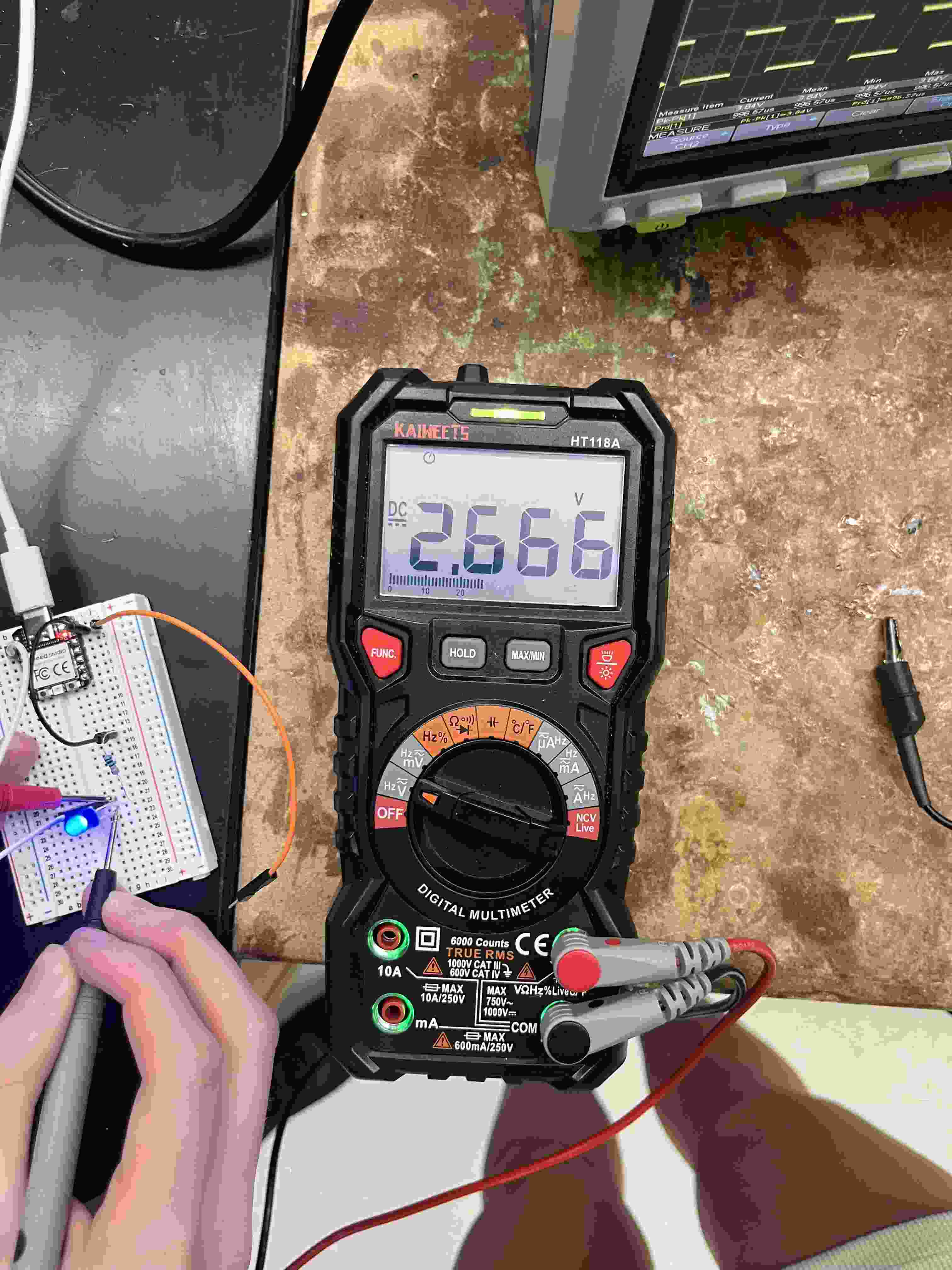 Multimeters are also very simple to use, just requiring the ground probe (usually black) to be connected to ground somewhere and the red probe connected to where you want to see voltage. For resistance, you just measure on the two sides of the resistor, and for current, you break the circuit and let the power flow through. By testing the voltage of an LED being dimmed and brightened by PWM, we were able to see crudely how the voltage was decreasing and increasing. for a deeper understanding, a multimeter is not good, and a oscilloscope or logic analyzer is required.