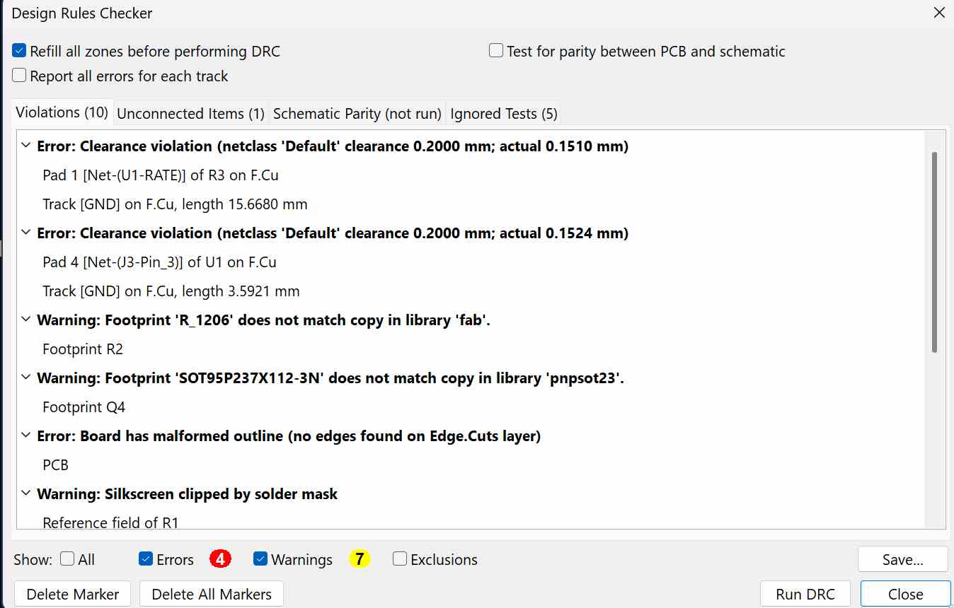 After finishing the rough board, I needed to fix some things. Specifically, after running the Design rules checker, I found where some traces were too close to eachother. By moving those tracks away from eachother, preventing the silkscreen from clipping, and fixing really small holes in the outline, I removed all major problems with the Board. I still have 2 warnings about some components footpritns not matching, but just physically looking at them im able to tell they are the right one, so I im not really worrying about those