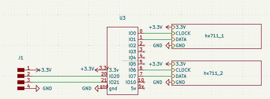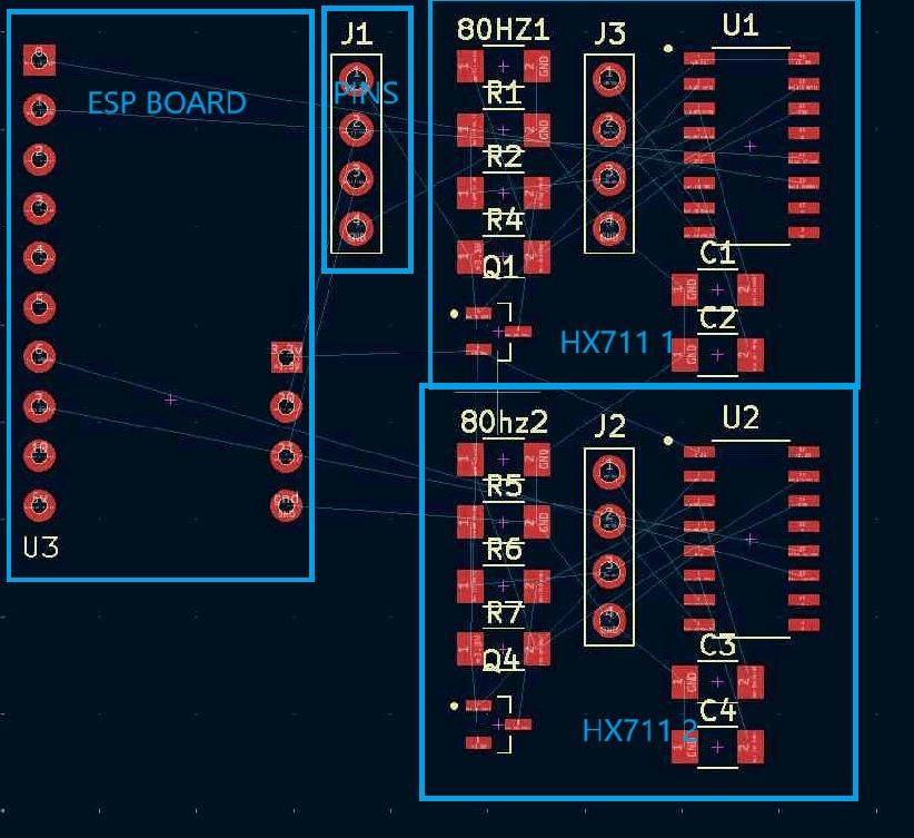 Before starting the pcb design, I needed to connect the microcontroller to the hx711s, Using the heriarchical sheets made this very easy, and all I needed to do was define the heriarchical pins, which are basically how a component not in the sheet can interact with the sheet. I then placed 2 of the sheets onto the main design, and defined the pins there so that they linked up. I also added in 4 pins on the left side, which are the tx and rx pins of the esp32-c3. I designed the module so that it would be very easy to add in tx and rx breakout, and so I said why not and added them in. My final schematic is below