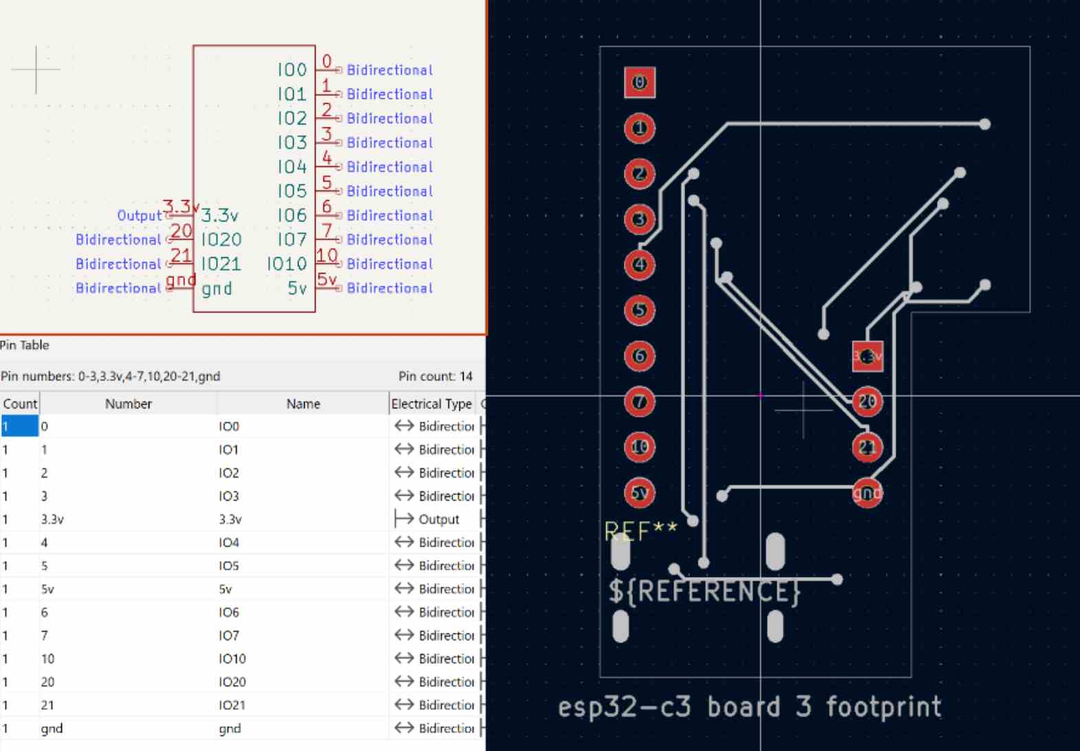 After finishing the symbol, I needed to assign pads. Pads are basically what allow the footprint and symbol to interact, like for example on the image below, I would assign the pad 3.3v to both the top left pin on the symbol design, and the top right pin on the footprint design, which connected them and allows kicad to know that this pin on the symbol is the same pin as this one on the design, and it should be routed as such