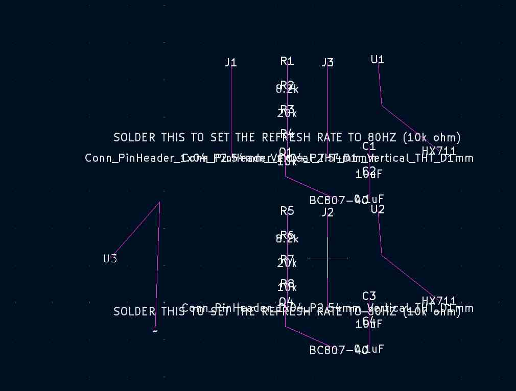 On my second go at it, I faired much better. keeping in mind some of the harder connections, like the two data and clock pins from the hx711, I was able to design first the right hx711 board and breakout, then the right one, which resulted in the image below