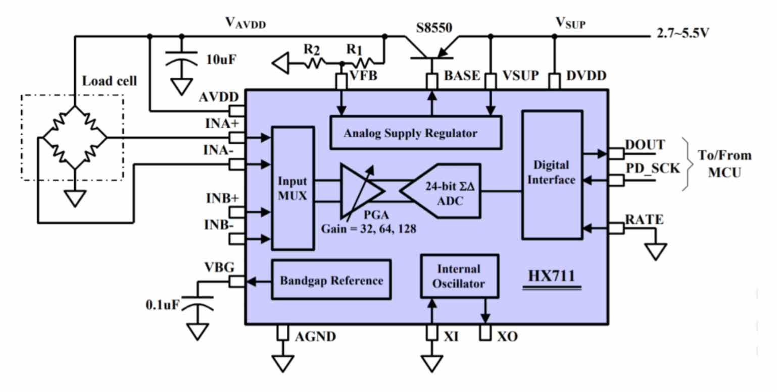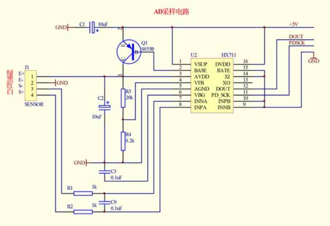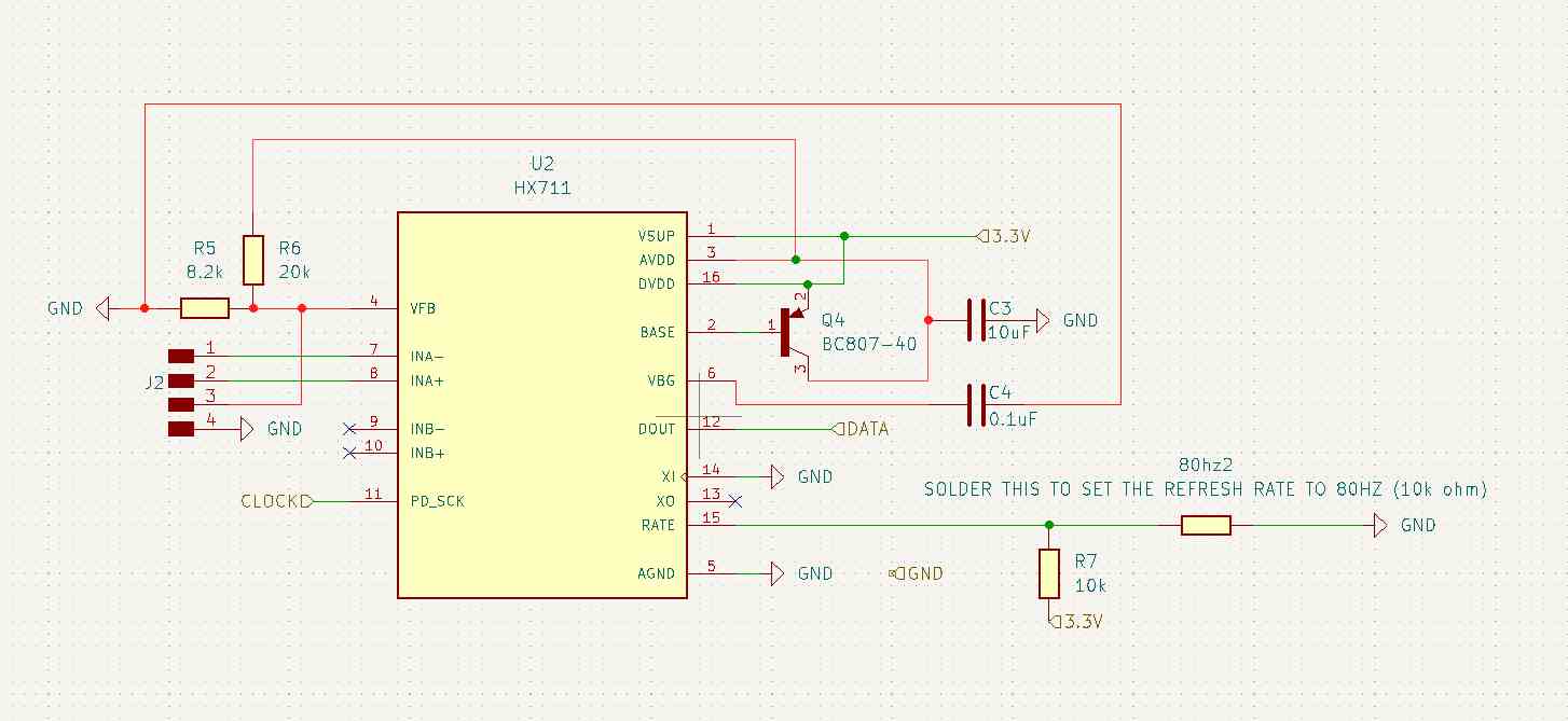 before even worrying about my microcontroller, I needed to get a hx711 with proper design. After getting all the schematics and footprints I needed, I wanted to start on making the board. I decided to recreate exactly what was shown in the reference image, and then modify it to work with my custom esp32-c3 microcontroller. I started by figuring out which parts my lab had, and I found a sot-23 transistor that would work perfect in place of the s8550.