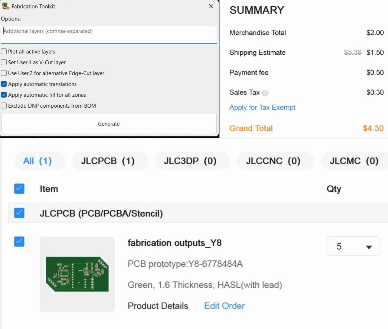 I am not a fan of milling PCBs, they just always go wrong when im involved. Because of that, and the fact that this board might need to survive a fall of over 20 cm, I wanted it made professionally. For that, I use JLCPCB. They are the best in terms of cost only, but they are Very Cheap. For ordering my board, I installed the plugins that didnt work on my laptop onto my computer, where they did work for some reason, and used the fabrication outputs from there to make a file that's template was pre-made for ordering online from JLCPCB After generating the files, I simply uploaded the zip to JLCPCB. I dont change any settings on my order, as JLCPCB always has sales for making 5 pcb's, where it is only 2 dollars when settings aren't touched. For shipping, I used the Global standard direct line, which is the cheapest by far shipping option available, but also takes between 8 and 13 business days to get to me. Im fine with waiting for this board, so I went to it. My final total for getting 5 of these boards professionally made was under 5 dollars, and it would take anywhere between 10 and 15 business days to get to me because of the 2 day build time