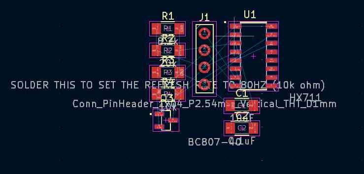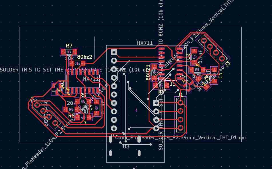 What I wanted from the pcb was a millable board with a hx711 and its 4 pins on each side of a microcontroller