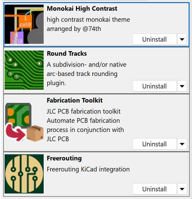 Before starting on the design, I wanted to get some of the plugins I used in the past, as they got uninstalled when I installed Kicad 9. The main plugin that I find very helpful is freerouter, which is an autorouter for Kicad. freerouter isn't perfect, but it is very good for just seeing how your final board will end up looking like. I also have a round track plugin, that I use solely because sometimes it looks cooler than unrounded tracks. I also use a custom theme that works better with OLED screens to save battery, and a fabrication output plugin to easily get all the files required for professionally making my board with JLCPCB. However, atleast on my laptop, all of the plugins did not work for Kicad 9. I found that the schematic editor worked fine with the custom theme, but trying to load the PCB would crash my Kicad. To fix this, I tried uninstalling all plugins 1 by 1 until it worked, but found that non of the plugins worked with Kicad 9