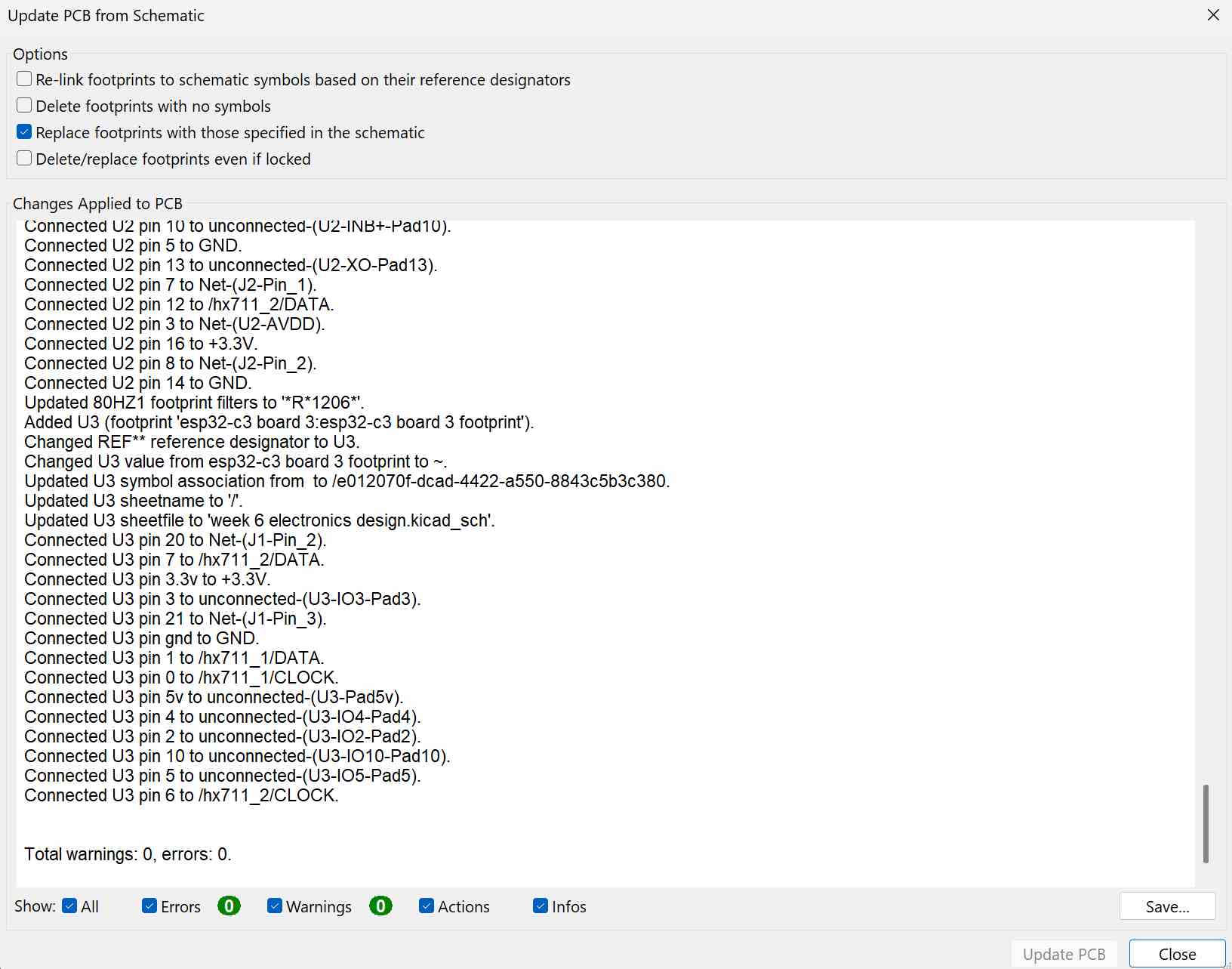 After running the update PCB from schematic tool, I got no errors thanks to clearly defining them in the schematic portion. As seen below, there are 3/4 parts of the schematic, being the esp main board, the first hx711 and required components, the second hx711 and required components, and some pins broken out from the esp32