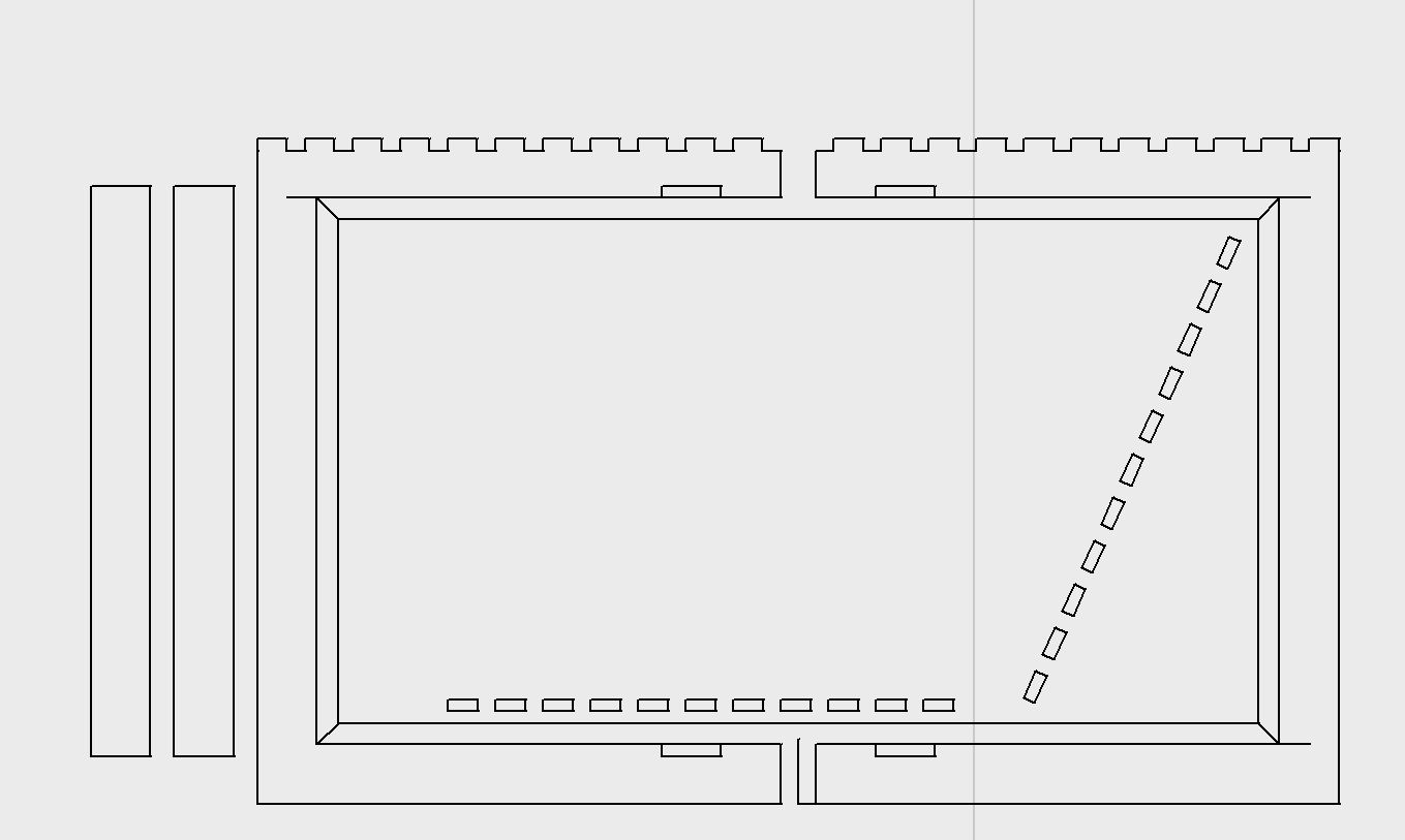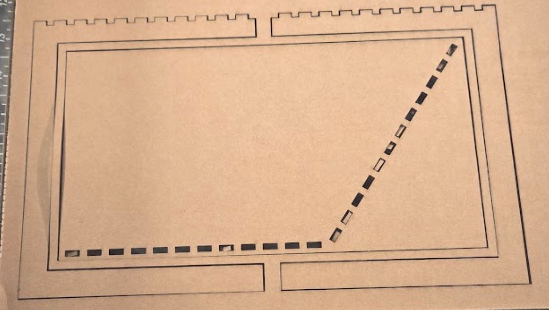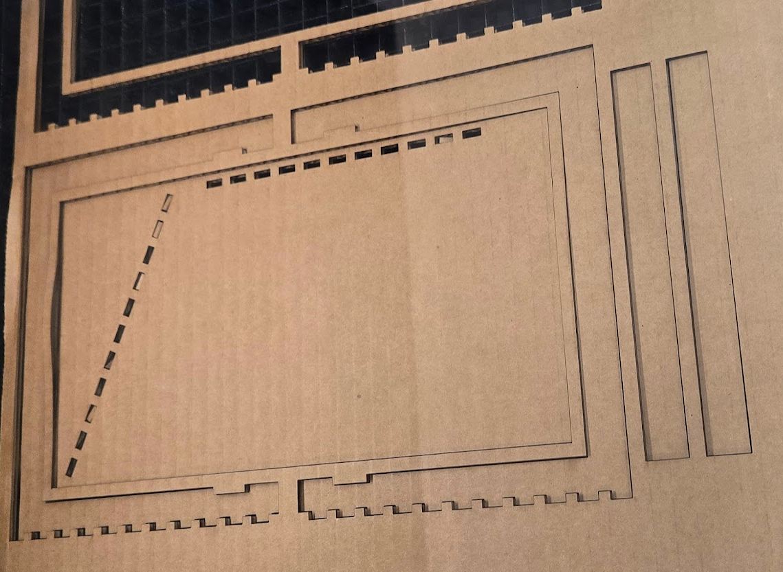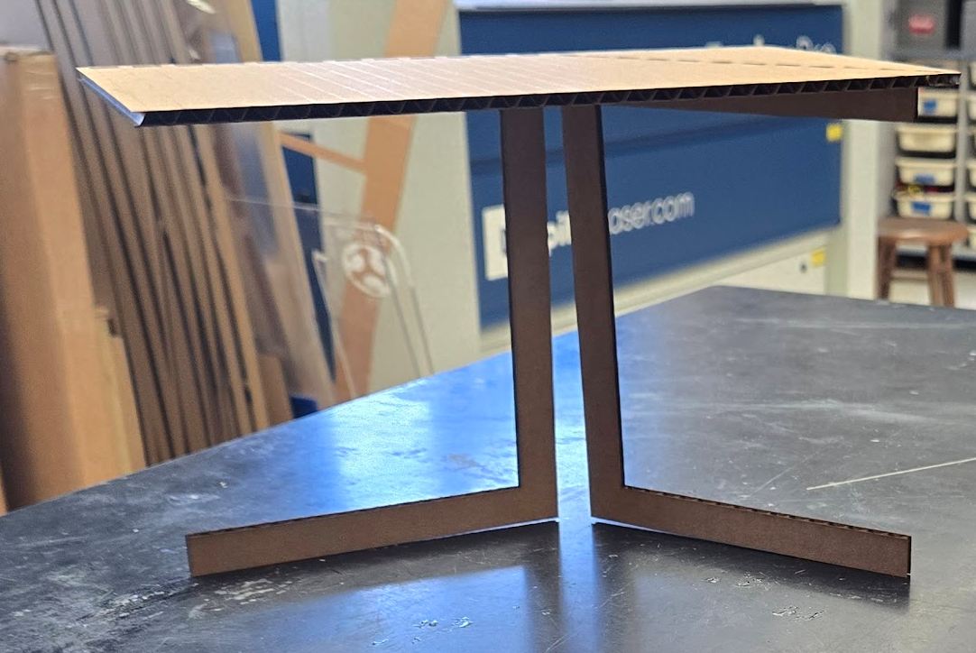 After finishing this design, everything looked good. I decided to do a cardboard test before on wood in order to realize my mistakes now. Because this was designed for .5 inch wood, and cardboard is (usally) .125 inches, I was able to simply scale down the entire design by .25x, which resulted in my design made for cardboard. After manually focusing to mitigate kerf, I cut on myy Fablabs laser cutter. After assembling it, I found that it wasn't that strong however, as it was attached by only 2 legs, and the supports for those 2 legs were right next to each other. I also found that while the legs had 11 tabs, I for some reason put 12 holes per leg onto the table,