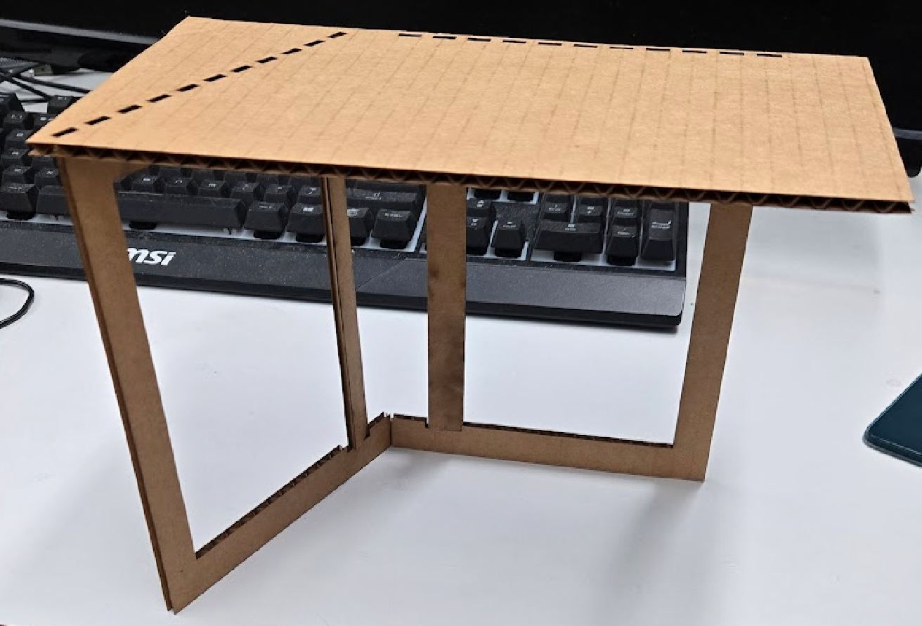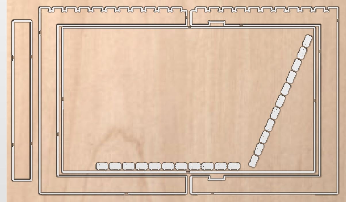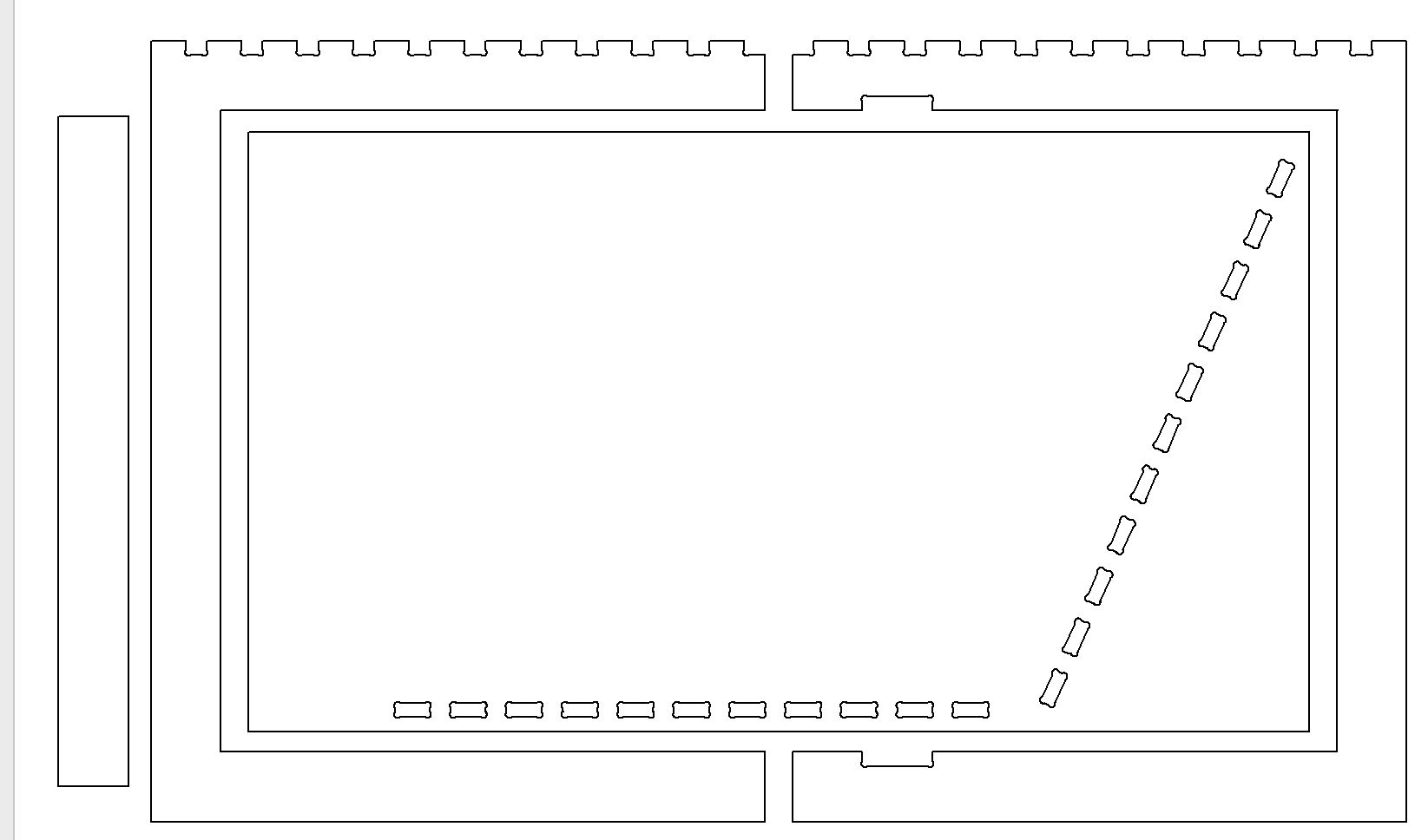 After finishing this design, everything looked good. I decided to do a cardboard test before on wood in order to realize my mistakes now. Because this was designed for .5 inch wood, and cardboard is (usally) .125 inches, I was able to simply scale down the entire design by .25x, which resulted in my design made for cardboard. After manually focusing to mitigate kerf, I cut on myy Fablabs laser cutter. After assembling it, I found that it wasn't that strong however, as it was attached by only 2 legs, and the supports for those 2 legs were right next to each other. I also found that while the legs had 11 tabs, I for some reason put 12 holes per leg onto the table,