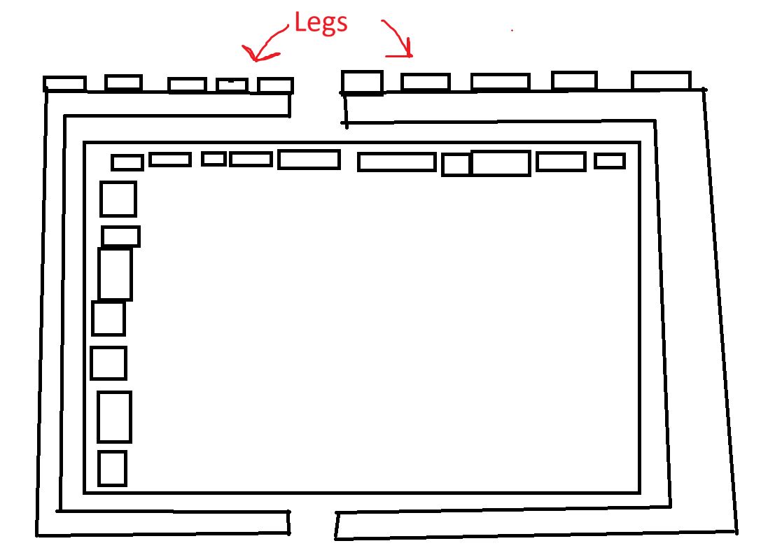 After starting the redesign, I had an idea to save space. seen in the really bad sketch below, I basically wanted to cut the legs around the top of the table, so that it used much less material vs cutting the legs besides the table top.