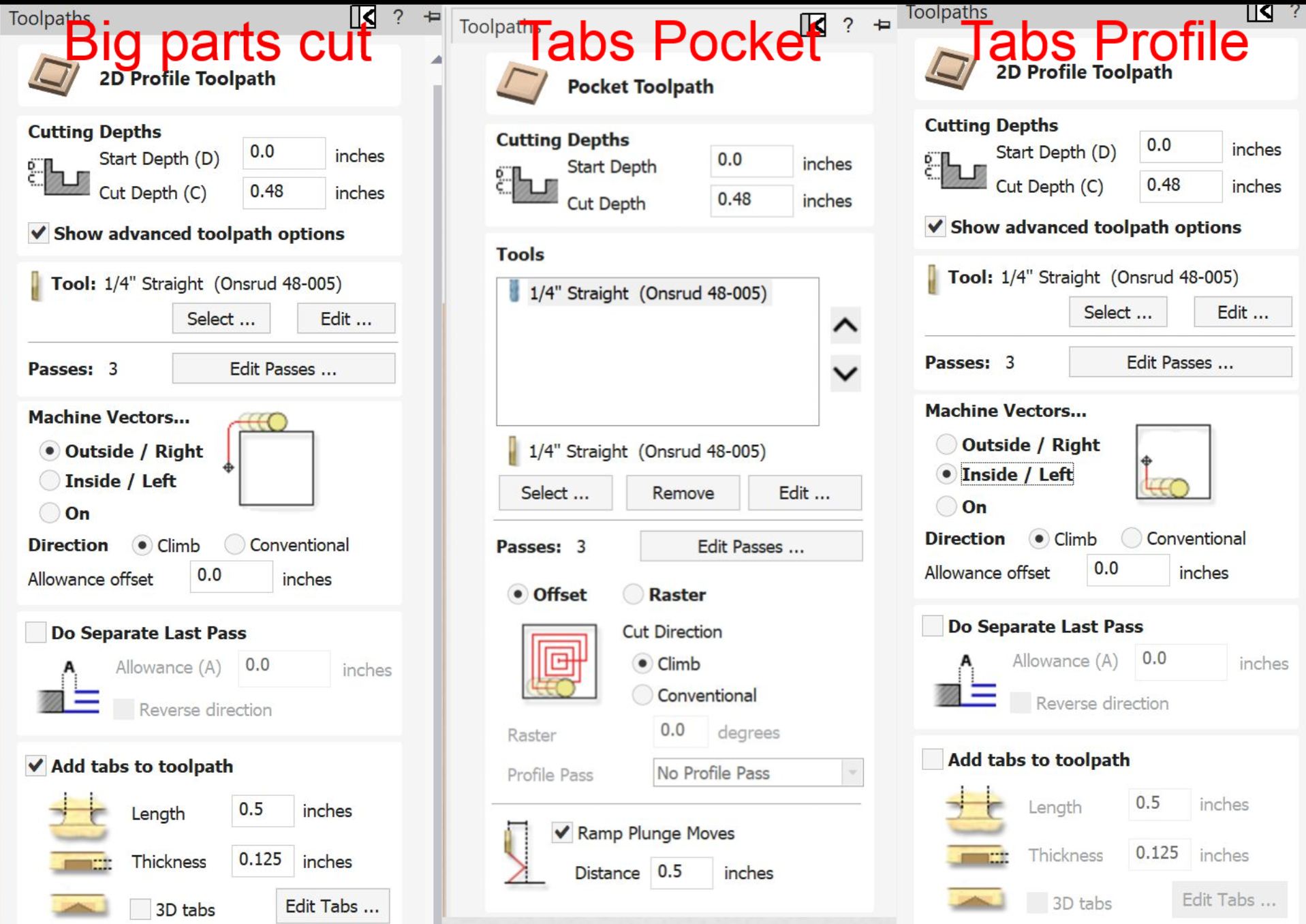 I did the pocket because I didn't want to have to make 4 tabs per tab I cut out, which would be 88 tabs that I would have to cut by hand if I used 4 tabs per cut. A pocket cut essentially removes all material in the area, vs a profile that removes an outline of the material.