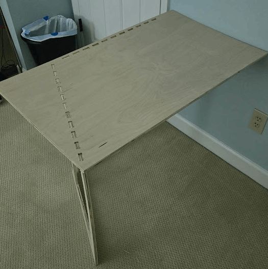 Designing is the funnest thing for me, I love to design it, but making it was not fun (as seen below). I started out designing just at random, then I decided on it being a corner desk that sort of requires learning onto the main desk, and then I started figuring out how to make that while using the least amount of material possible. All of this was a fun challenge, and incorporating a variable for material thickness, tab width, and table height saved me from a manual redesign when I made the choice to cut at .48 inches material thickness instead of .5, which kind of sabotaged me. Also I think I should of used what I learned the Computer Controlled Cutting week, and chamfered the edges or used a better joint than what I used.
