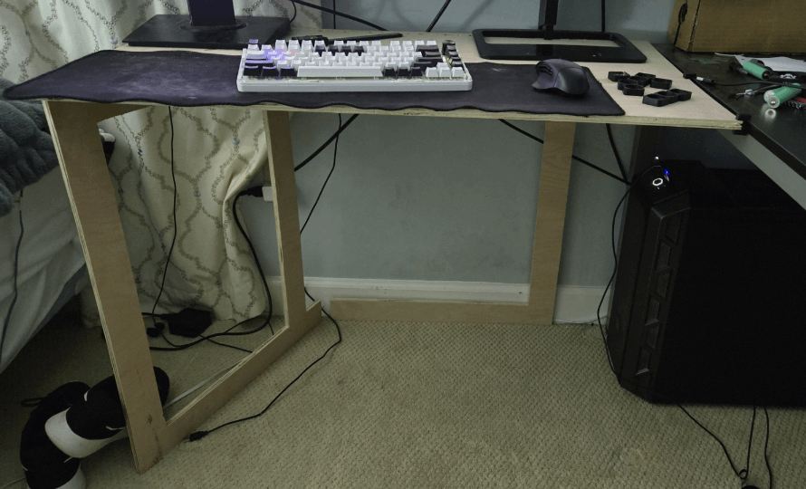 after getting the desk to stand on its own, I had to add it to the main desk. For this I designed really tight 3d prints that fit both the old one (.46 inches on the edge) and the new desk (.52 inches on the edge). I made a simple sketch in fusion, and then printed it. It miraculously fit really well first try, but I did print multiple to give it more than just one point of contact between the two desks. This are essentially acting as the third leg on the desk, supporting it on the right side while I have the legs support the back and the left