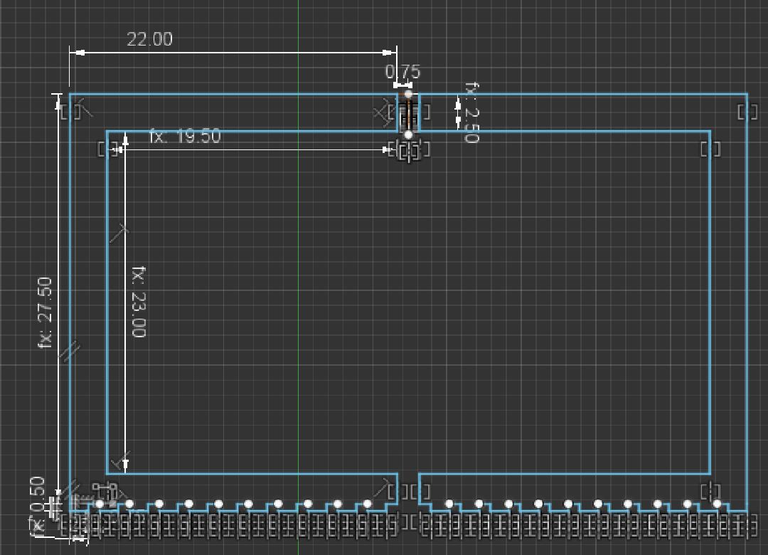 I started working on this first with the legs, planning on designing the desk to be as big as I could make it inside the legs. I decided on 11 tabs per leg, which looking back on it was way overkill, and lead to a lot of headache later. I made the leg in a U shape, planning on making one then mirroring to create the other. I also made sure to pay attention to using dimensions on important parts, like the height on the table, the amount of space between the top and bottom of the table leg, and the tab width and height.