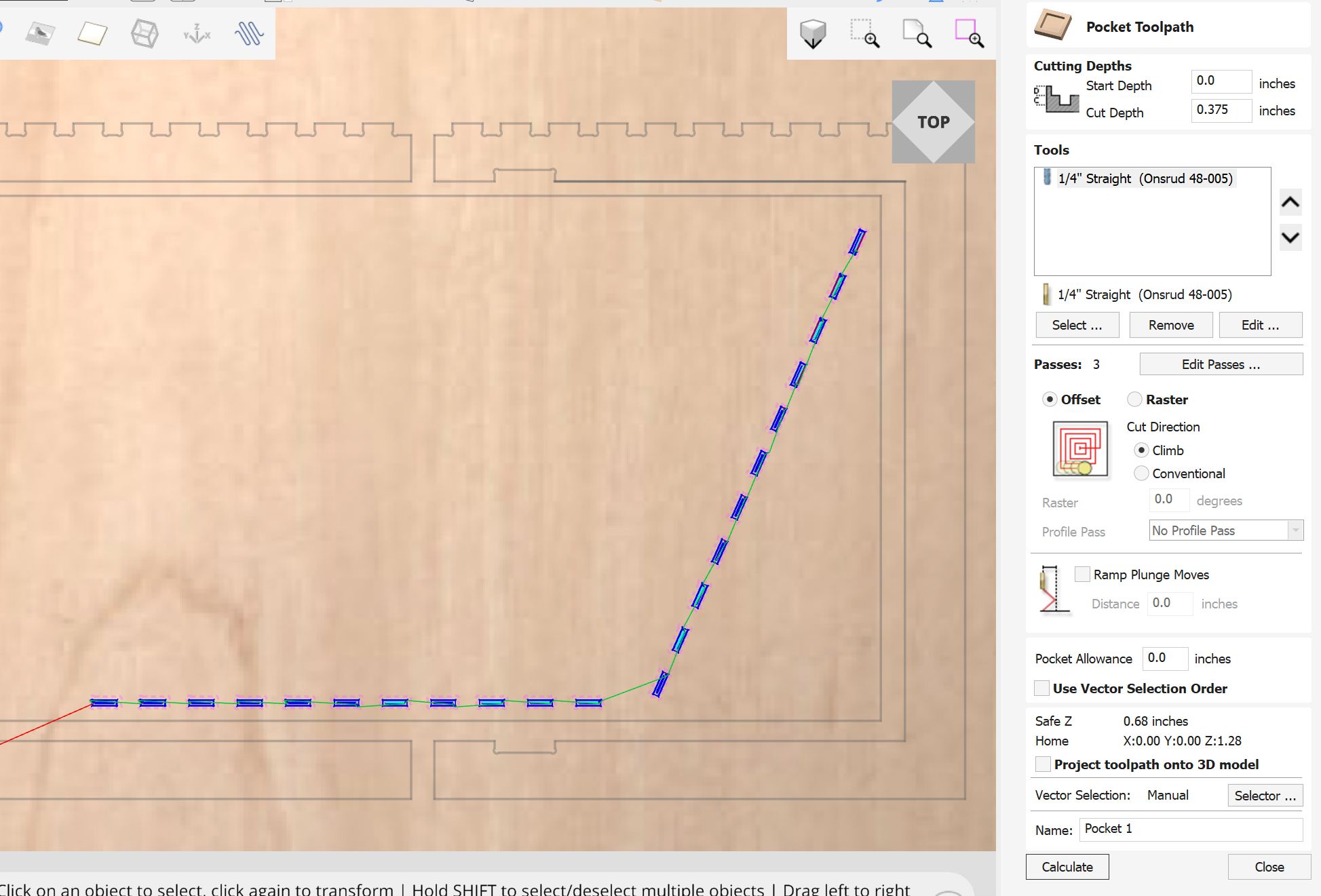 After getting the hopefully final design all set up in aspire, I started to figure out the toolpaths. I decided on two separate ones, a pocket for the tabs in the middle of the table, and a profile for everything else.