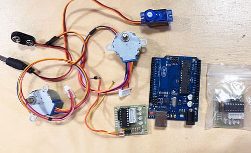Our Polargraph uses two 28BYJ-48 stepper motors with ULN2003 driver boards, an Arduino UNO R3, and a servo motor to lift and lower the pen.
