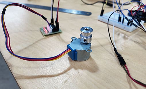 We started by testing the stepper motors individually using the ULN2003 driver boards. The ULN2003 has 4 control inputs (IN1–IN4) and a 5-pin output connector that connects directly to the stepper motor. For each motor, we assigned four digital pins from the Arduino.