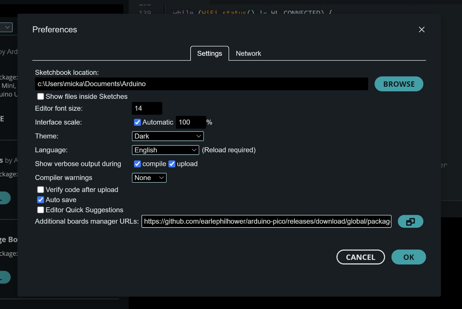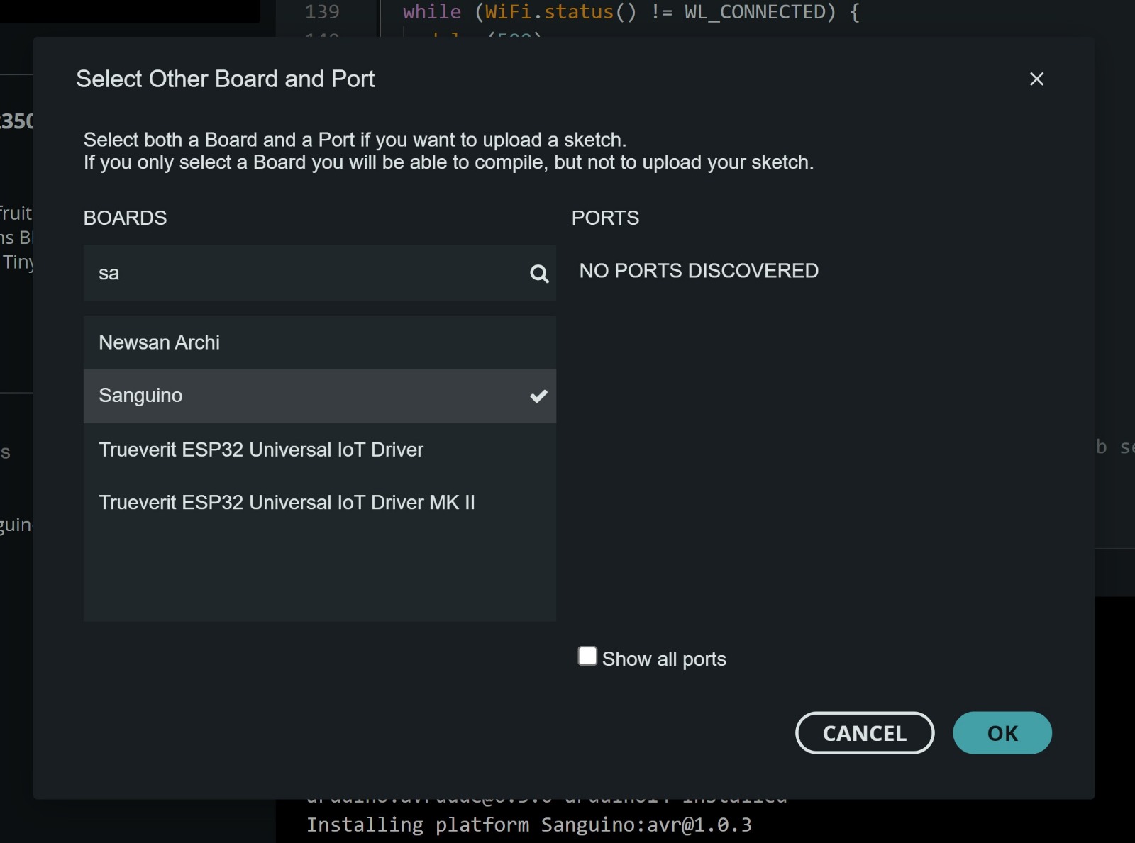 First, we attempted to install the firmware using the Arduino IDE. Unfortunately, the controller was not recognized by the IDE.