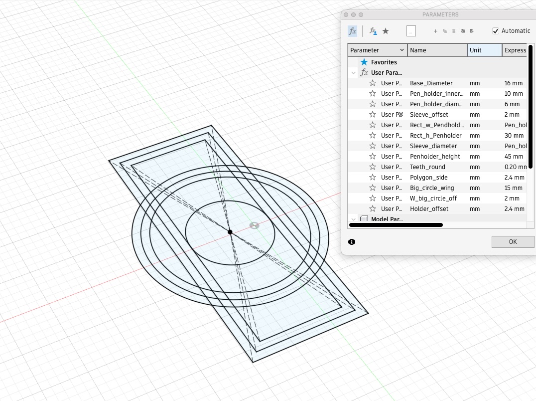 In Fusion 360, I built the components using parametric design, allowing me to easily modify the bodies as needed. Below, you can see the sketch of the pen holder along with its sleeve.