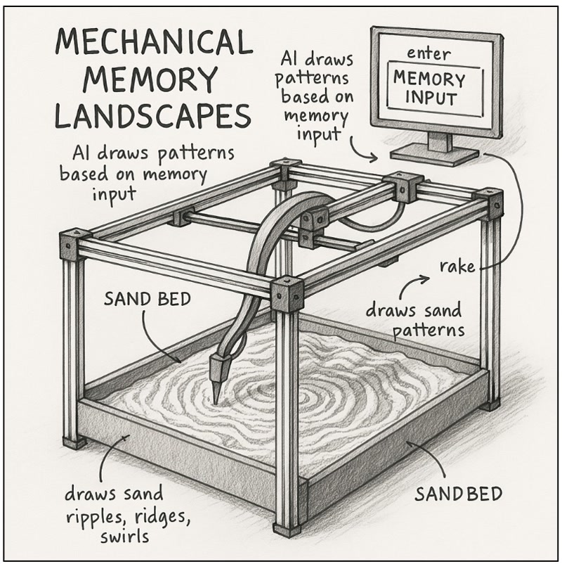 In our group project, we decided to create the machine “RYOAN-JI XY 2025,” based on a CoreXY module, which uses an LLM to generate a desktop karesansui and haiku inspired by input images.