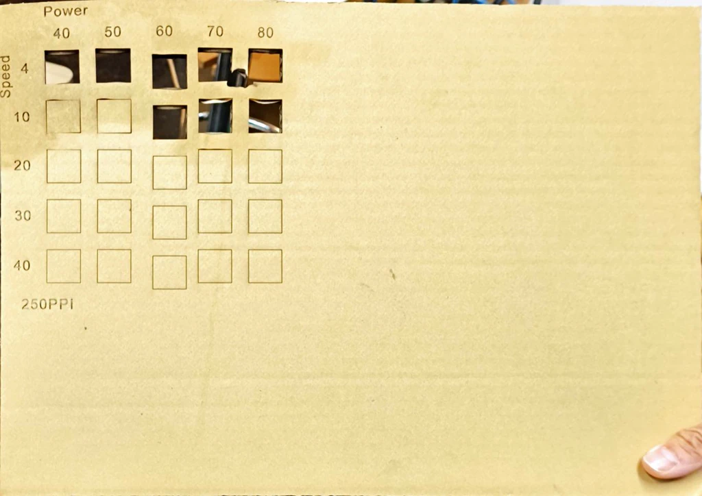 - During adjustments, at 80% power and 4% speed, the cardboard started to catch fire. Monitored and extinguished with water.
