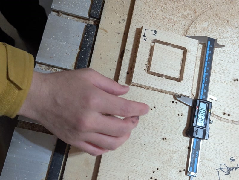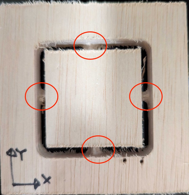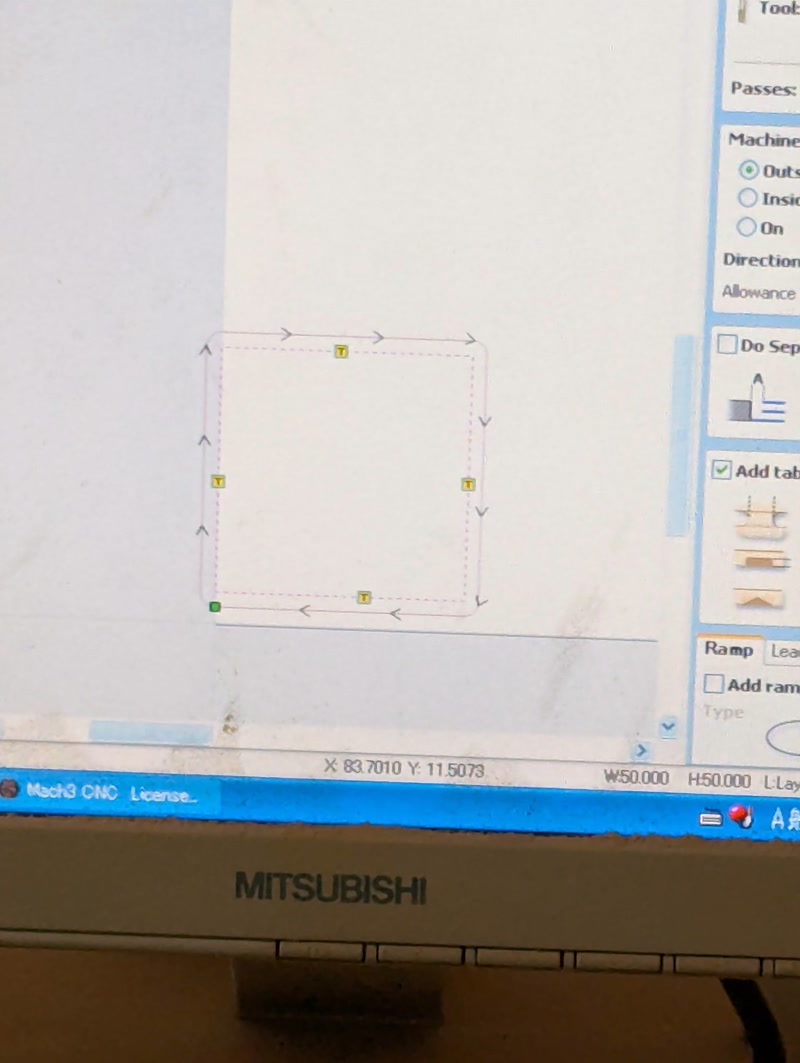 We used Cut2D to draw a 100mm x 100mm square and a 50mm x 50mm square with the same center, and then made a test cut.