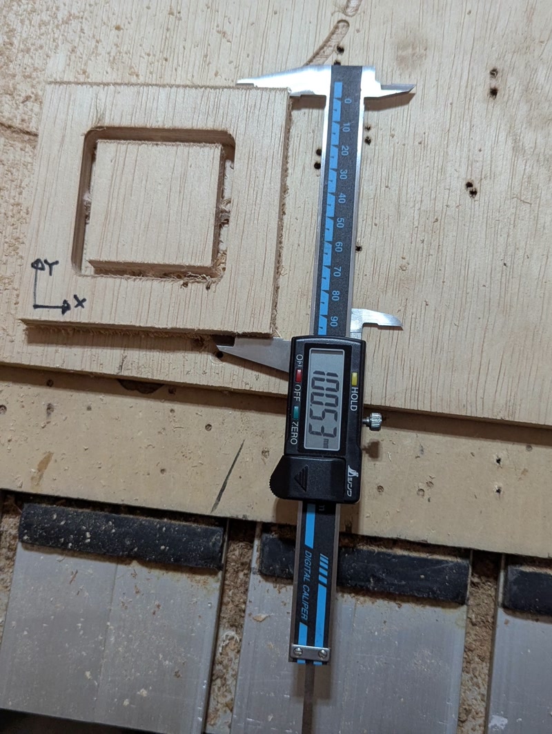 After completion, we measured the dimensions of the cut section using calipers. The x-coordinate and y-coordinate of the 100mm × 100mm square are +0.38 and +0.53, respectively. The kerf around the inner square was 6.01mm, which is 0.01mm larger than the diameter of the end mill used (6mm). This indicates that the kerf (cut width) was wider than intended due to the end mill’s runout (axis deviation). By cutting the inner square, measuring its dimensions, and comparing them to the theoretical values, we were able to verify the effects of the kerf and runout.